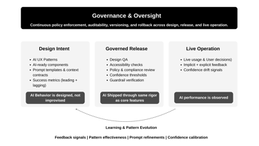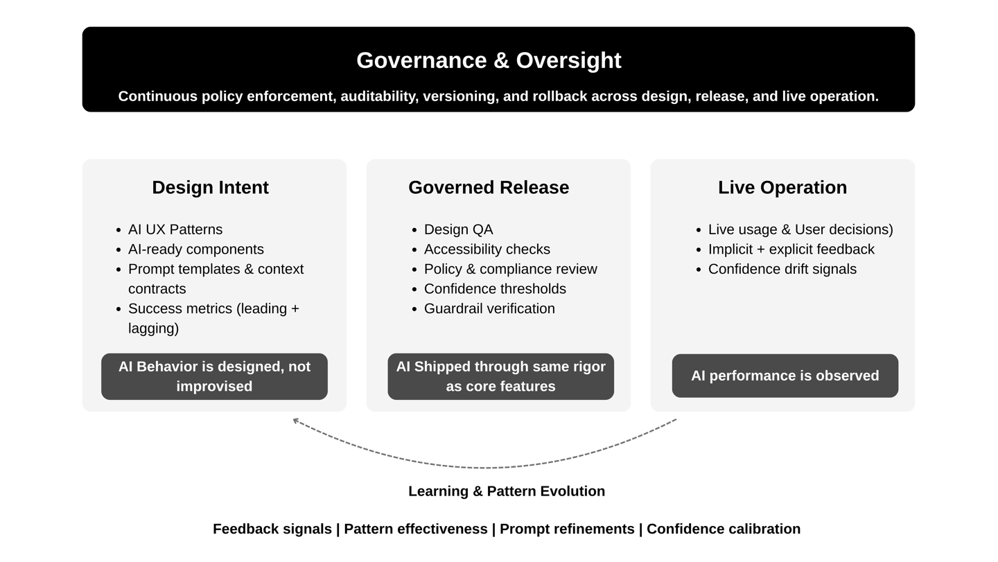 While the patterns, acceleration frameworks and design system integration was key - it was the overarching governance and oversight model that allowed us to ensure that AI was mapped where it was making or influencing decisions across customer, employee, and system layers. Then identify where those decisions lack visibility, control, or consistency.